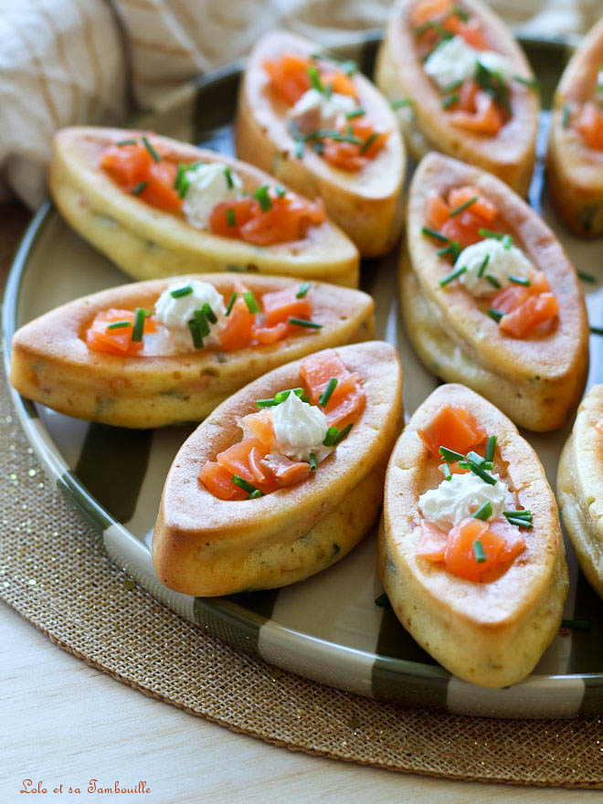 J’ai opté pour la cuisson dans le moule 12 barquettes amande Ohra Guy Demarle, un moule qui permet ensuite de venir customiser les moelleux au gré de ses envies. Ici, avec un peu de dés de truite fumée et le restant de chèvre frais (pas de gaspillage !), et un peu de ciboulette (comme souvent tant qu’elle est au jardin) pour apporter la petite touche de fraîcheur.