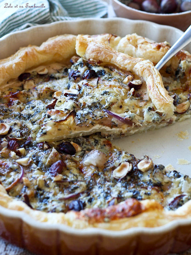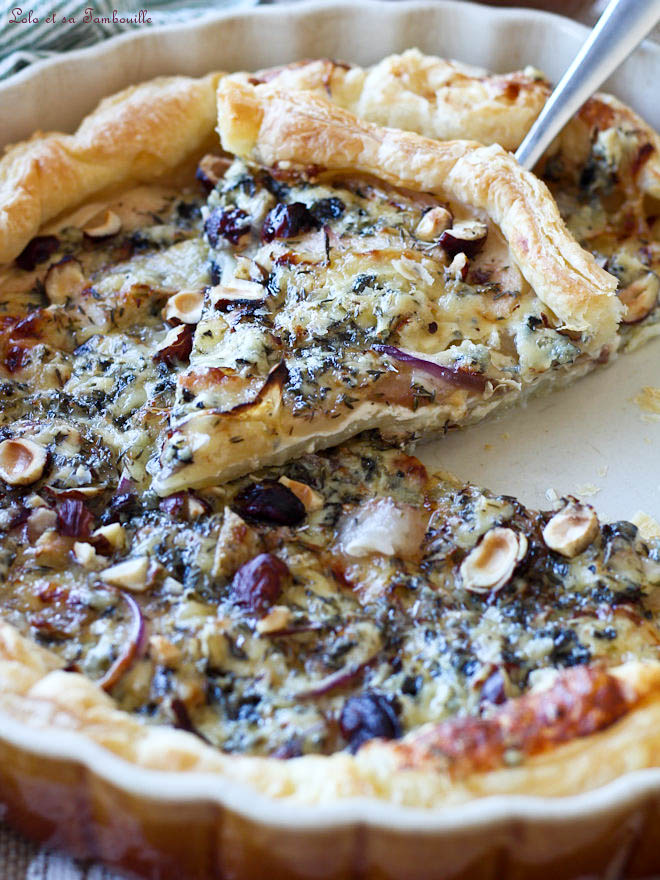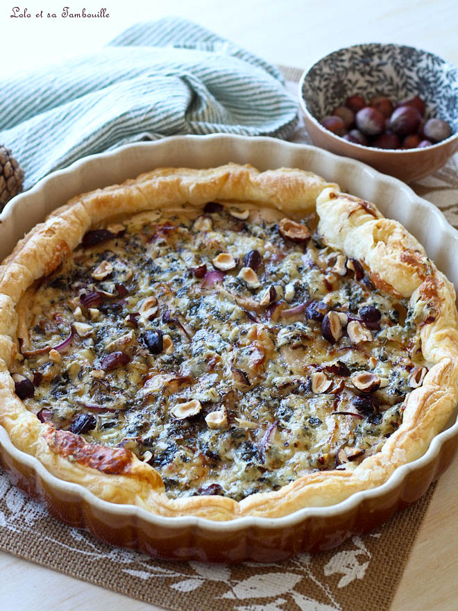 J’ai ajouté également un restant d’oignon rouge que vous pourrez là encore remplacer par de l’oignon jaune sans problème et j’ai parsemé cette dernière de quelques noisettes avant d’enfourner, pour la touche croquante. En accompagnement d’une belle salade, cette tarte était un délice, un repas des plus agréable !