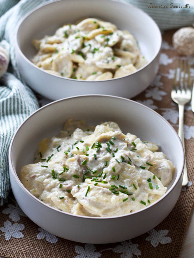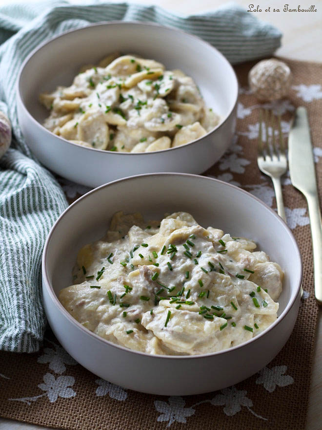 Pourtant, vous allez le voir, peu d’ingrédients, si ce n’est des pâtes, de l’ail et de l’oignon, un peu de crème, du parmesan, du thon en boîte et un peu de ciboulette : simple et efficace !