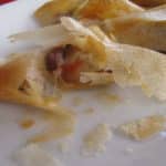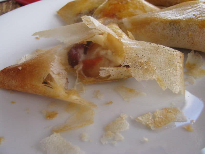 Replier les feuilles de brick dans la longueur, et disposer une St Jacques, un peu de chorizo et 2 morceaux de cantal à 4 cm du bord.
