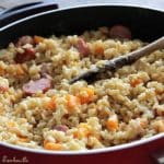 Peu de temps avant que l’ébly soit cuit, ajouter dans la sauteuse les dés de butternut ainsi que les rondelles de saucisse et mélanger intimement.