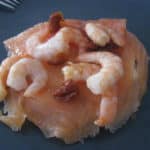 Une fois les blinis réchauffés, étaler un peu de fromage puis déposer une tranche de saumon fumé et un peu du mélange crevettes/tomates.