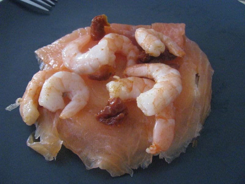 Dans un petit bol mélanger les crevettes avec la pincée de paprika et les tomates séchées coupées en petits morceaux.
