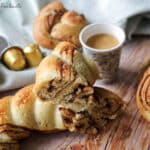 Pour ma part voulant faire des individuelles, après avoir étaler le praliné, rouler en boudin et coupé dans la longueur mon boudin de pâte, j'ai recoupé chaque brins en morceaux et les entortillés deux part deux.