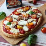 Déposer de la sauce pizza Cirio sur les tranches de pain puis y répartir quelques moitiés de tomates cerises.