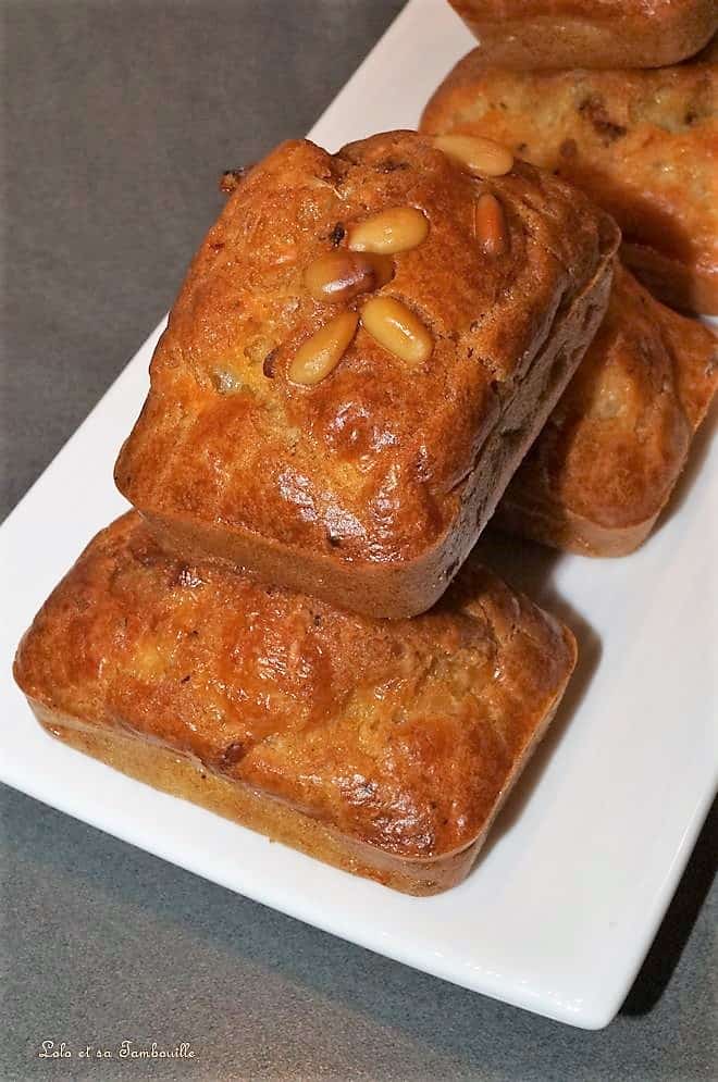 Mélanger brièvement le tout, verser la préparation dans des empreintes à mini cakes en silicone puis parsemer de quelques pignons de pin.