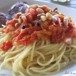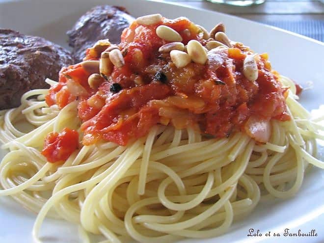 Une fois l’eau rendue par les tomates quasiment évaporée, ajouter les pignons de pin et servir sur un plat de spaghettis par exemple.