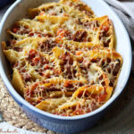 Garnir les pâtes avec le restant de bolognaise, en les disposant au four et à mesure dans le plat, en les serrant bien.