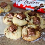 À la sortie du four, déposer un morceau de Kinder Bueno sur chaque cookies en appuyant légèrement.