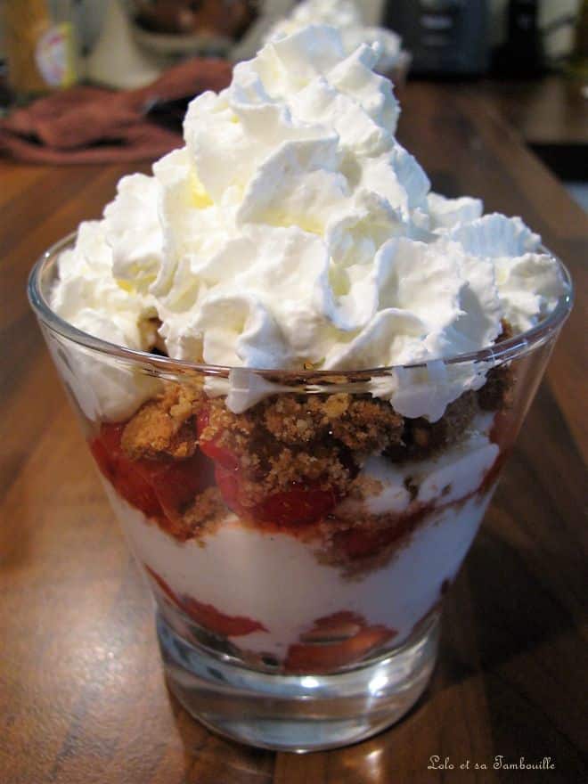 Dans deux verres, disposer des spéculoos émiettés, des fraises et de la crème.