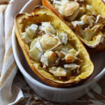 Au bout de ce temps, prélever une bonne partie de la chair avec une cuillère et la déposer dans un plat (attention à ne pas trop prélever de chair non plus, la courge devant être à nouveau farcie).
