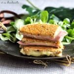 Sur l’un des côté beurré, déposer 1 tranche de fromage et recouvrir d’une tranche de jambon pliée en deux.