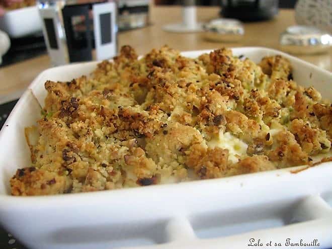 Déposer cette pâte grumeleuse et sableuse sur le chèvre en la répartissant bien.