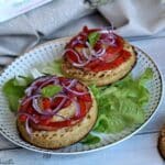 bacon, basilic, chèvre, comté, crème fraîche, crumpets, oignon rouge, poivron rouge