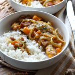 butternut, cidre, cuisses de poulet, lardons, moutarde, oignon, thym