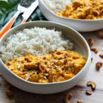 Servir bien chaud en accompagnement de riz et parsemé de noix de cajou torréfiées grossièrement concassées et de coriandre.