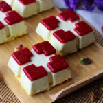 Répartir la mousse à la pistache dans les empreintes, sur la gelée de framboises.