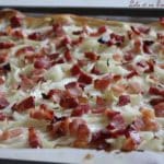 Répartir le fromage blanc sur le fond de pâte, puis y répartir les oignons ainsi que les lardons.