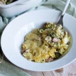 ail, brocolis, crème de soja, emmental, saucisses de Montbéliard