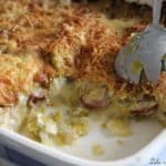 chapelure, crème fraîche, emmental, lardons, moutarde, poireaux, saucisses de Montbéliard