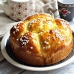 Dorer la brioche à l'aide du jaune d’œuf battu puis parsemer de sucre en grain.