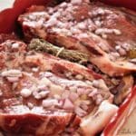 Comme le précise Miamm… maman cuisine, chez qui j’ai trouvé cette recette, il est possible de récupérer la marinade en la filtrant, et en la faisant réduire à la casserole avec une noix de beurre. Elle pourra être servie en sauce en accompagnement de la viande. Personnellement, je me suis servie du reste de marinade pour faire mariner des côtelettes d’agneau (prévues en plus mais qui n’ont pas été mangées au vue de la taille monstrueuse des côtes de porc).