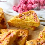 Concasser grossièrement le chocolat blanc et l'ajouter avec les pralines roses.