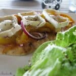 Déposer des rondelles de chèvre, parsemer de basilic et enfourner pour 4 minutes à 200°C.