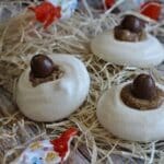Une fois les meringues refroidies, en garnir le creux de praliné et poser un schoko-bons coupé en deux au centre.