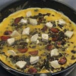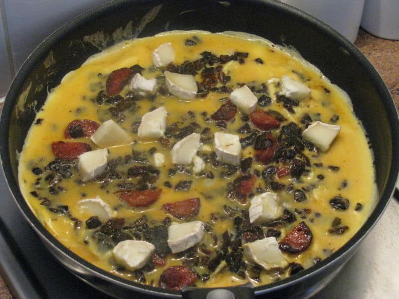 Une fois que le chorizo a prit une jolie couleur, ajouter les oeufs puis peu de temps après les quartiers de chèvre.