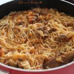 Dans une sauteuse assez large pour contenir les spaghettis entiers, faire revenir dans l’huile d’olive, l’oignon et l’ail avec la viande hachée égrenée pendant environ 5 minutes.