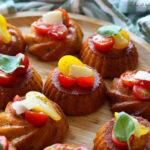 Laisser complètement refroidir avant de venir déposer dans le creux, des tomates cerises coupées en deux et quelques copeaux de parmesan et des feuilles de basilic.