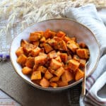 Verser les cubes de patates douces sur une plaque en aluminium perforée recouverte d'une toile silpat.