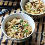 Ajouter le riz et mélanger intimement avant de verser la sauce soja et de mélanger à nouveau.