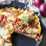 Dans une sauteuse, faire revenir l'oignon émincé et les lamelles de poivron avec un filet d'huile d'olive, pendant 15 minutes sur feu moyen, en prenant soin de les remuer régulièrement.