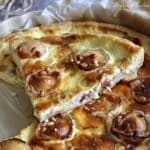 Disposer les lardons puis verser l’appareil à base d’œufs, de crème et de lait.