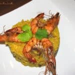 A mi cuisson du riz y incorporer la dosette de safran, les cèpes réhydratés et les morceaux de crevettes.
