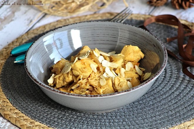 amandes effilées, curry, escalopes de poulet, oignon, raisins secs