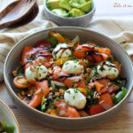 Keyword avocat, mozzarella, noix de cajou, oignon cébette, poivrons grillés, roquette, tomates cerises, truite fumée, velours de vinaigre balsamique