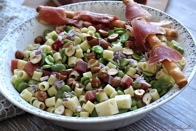 ciboulette, fèves, huile de noisettes, jambon de Bayonne, noisettes, oignon rouge, tome de vache