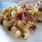 Y ajouter les pâtes, les morceaux de tomates séchées, les morceaux bacon, les pignons de pin et le basilic.