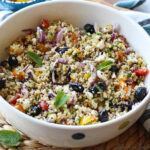 basilic, ciboulette, feta, menthe, oignon rouge, olives noires, quinoa, tomates cerises
