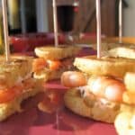 Étaler un peu de fromage frais sur 8 moitiés et disposer deux crevettes.