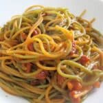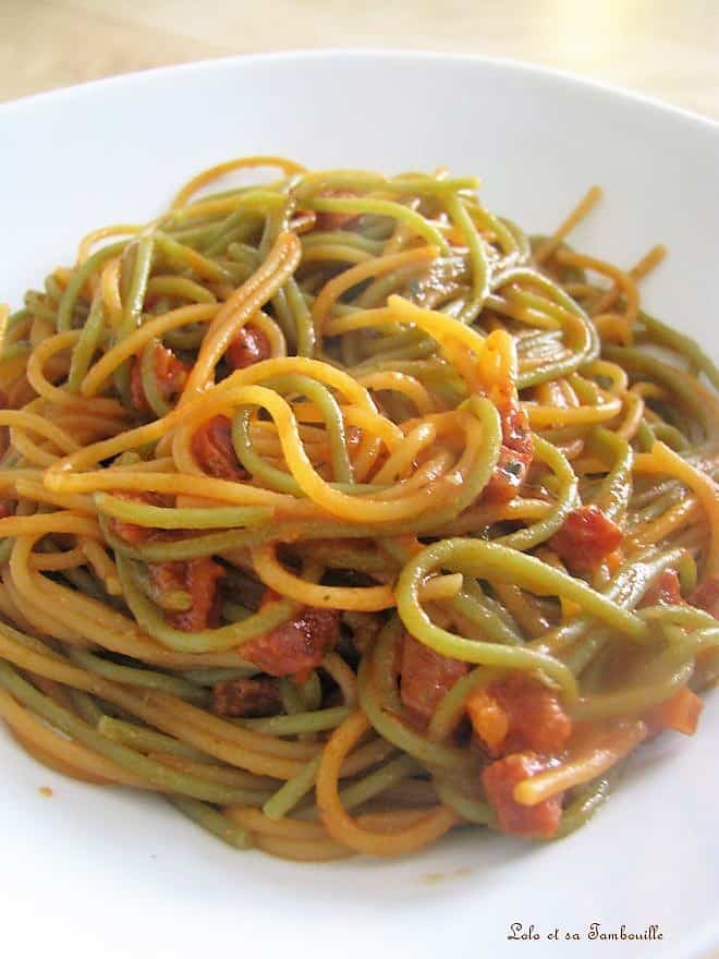 Une fois les pâtes cuites, les égoutter et les verser directement dans la sauteuse.