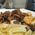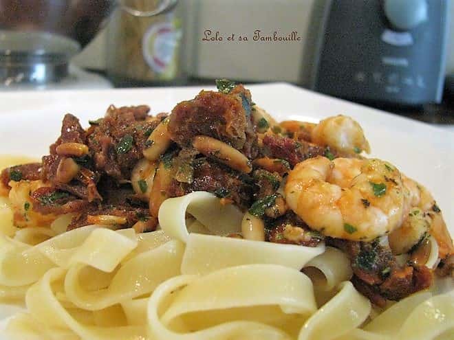 Une fois les pâtes cuites, les dresser sur une assiette et déposer dessus la préparation aux crevettes.