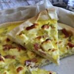 Déposer sur le fond les poireaux, les lardons puis verser enfin l’appareil à base de kiri dessus.