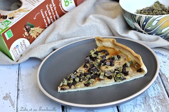 bananes, cannelle, compote, crème liquide, granola, pâte brisée, pépites de chocolat