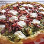 Foncer un moule à tarte avec la pâte feuilletée et piquer le fond à la fourchette. Disposer les courgettes puis recouvrir de lardons et enfin de billes de mozzarella.