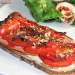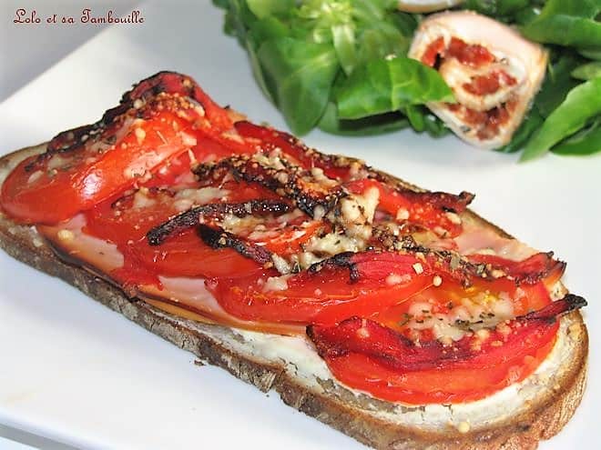 Faire griller le poivron rouge sous le grill du four jusqu’à ce que sa peau se noircisse et boursouffle. Le peler et le couper en fines lamelles. Réserver. Laver et couper les tomates en rondelles.