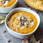 Verser dans les bols et parsemer le dessus un peu de granola salé, des noisettes torréfiées ou des croûtons.